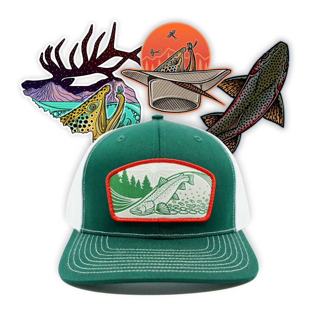 - Artwork features a Trout riding the current in a rocky-bottomed river