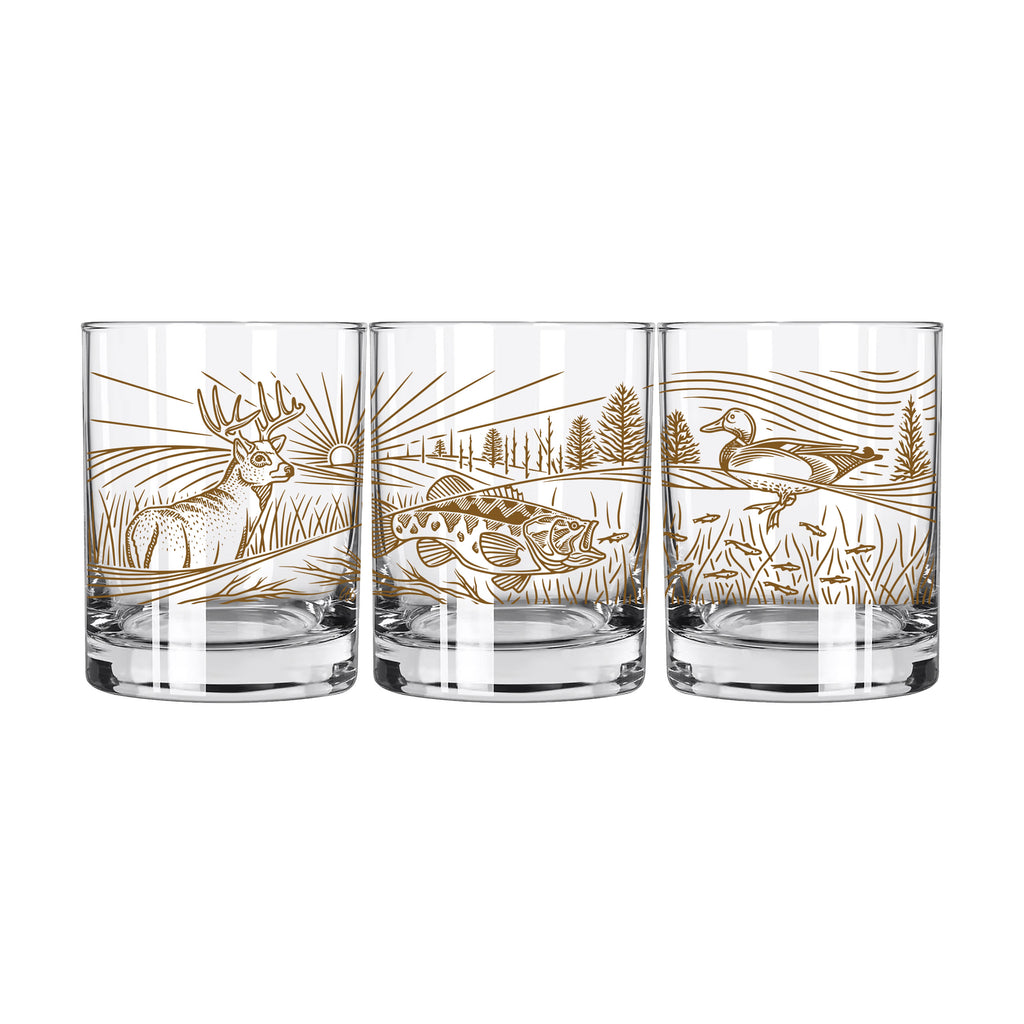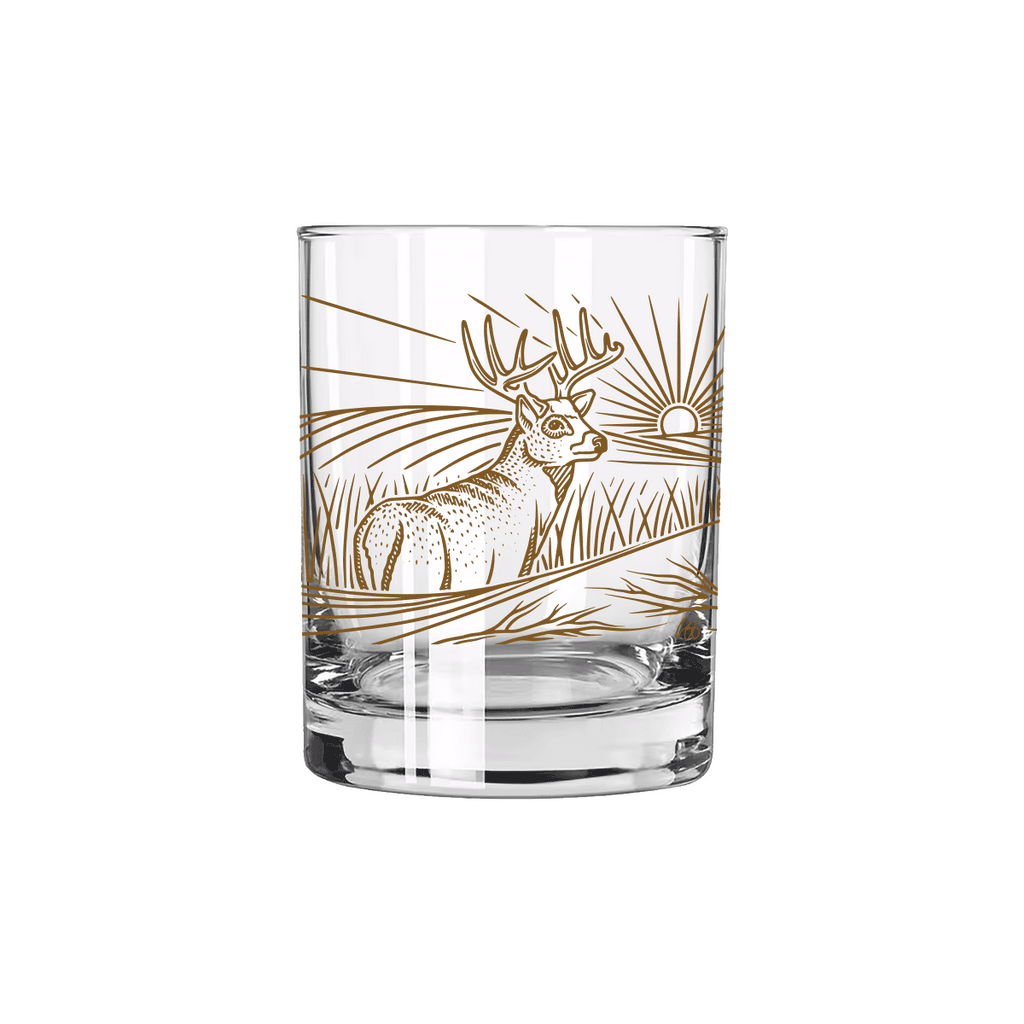 This 14 oz Double Old Fashioned Glass features a full wrap of Casey's "Buck & Bass" design, depicting a Whitetail Buck, Largemouth Bass and Mallard in one scene. This artwork is screen printed in an elegant, gold metallic ink. The perfect vessel for your favorite cocktail or simply some whiskey, bourbon or scotch on the rocks.