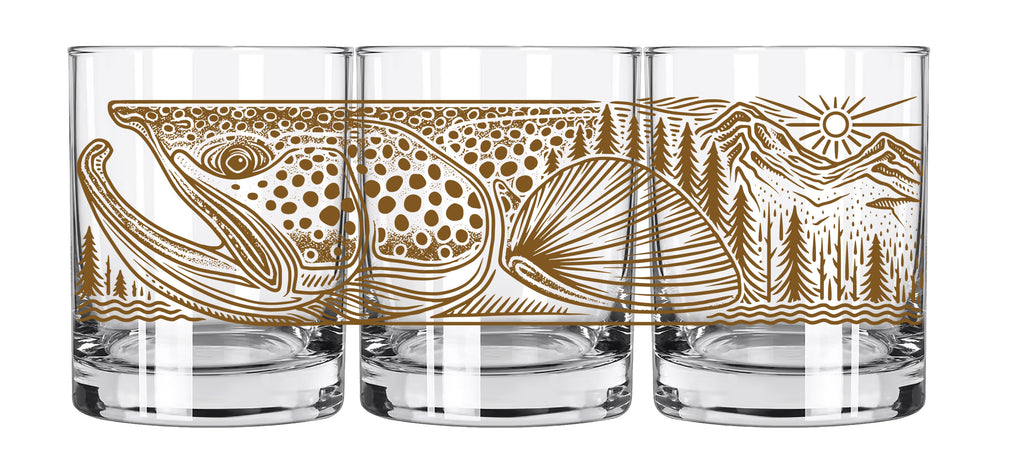 This 14 oz Double Old Fashioned Glass features a full wrap of Casey's "Trout-Scape" design screen printed in an elegant, gold metallic ink. The perfect vessel for your favorite cocktail or simply some whiskey, bourbon or scotch on the rocks.